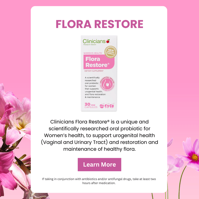 Clinicians Flora Restore® contains two unique clinically documented probiotic strains to colonise the vagina and urinary tract after oral intake to restore and maintain healthy urogenital flora (Lactobacillus rhamnosus GR-1 and Lactobacillus reuteri RC-14).